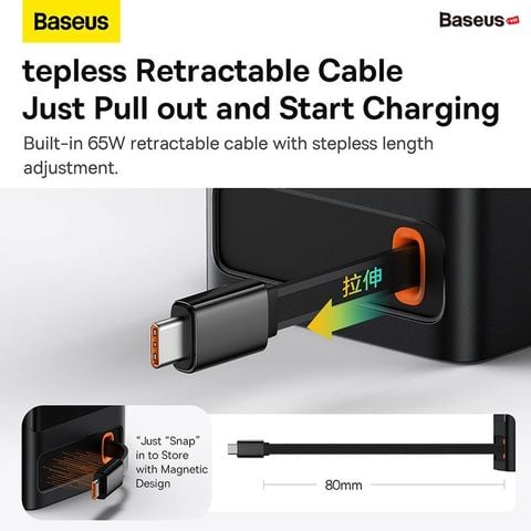 Tích hợp sẵn bên trong một sợi cáp sạc siêu nhanh 65W có thể kéo ra với độ dài tối đa 0.8m, rút lại vô cần tiện lợi với độ bền lên tới 5000 lần kéo, tuổi thọ 10 năm.
