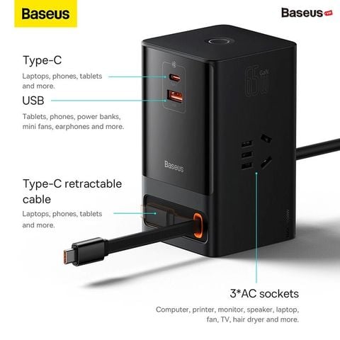 Với việc tích hợp dây dẫn nguồn AC nối dài kèm theo 3 ổ cắm điện AC, Baseus PowerCombo Digital Powerstrip không chỉ là một củ sạc đa năng mà nó còn được sử dụng như một ổ cắm điện thông minh, đáp ứng mọi nhu cầu và không gian làm việc của bạn. Chỉ với Baseus PowerCombo Digital PowerStrip có thể đảm bảo cấp nguồn cho tất cả các thiết bị của bạn từ AC đến DC.