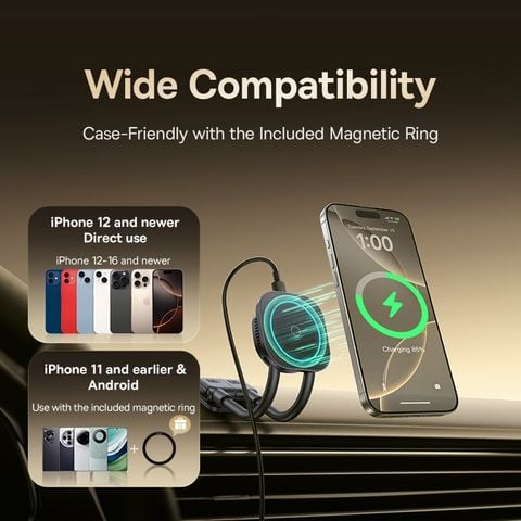 Điểm nổi bật nhất của PrimeTrip C03S Pro là khả năng sạc không dây từ tính lên tới 15W, tương thích hoàn hảo với công nghệ MagSafe của Apple. Chỉ cần đặt iPhone 12 trở lên lên đế sạc, nam châm sẽ hút chặt điện thoại và bắt đầu sạc ngay lập tức. Tính năng này giúp loại bỏ rắc rối với dây cáp, giữ cho không gian xe của bạn luôn gọn gàng và việc sử dụng điện thoại trở nên liền mạch. Ngoài ra, nó cũng có thể sạc không dây cho các điện thoại Android.