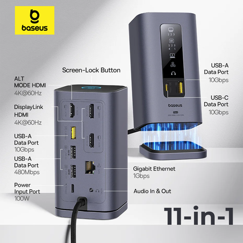 Hình Ảnh Hub Mở Rộng Đa Năng Baseus Spacemate Series 11-in-1 (Type-C to 3*HDMI 4K@60Hz+2*USB-A (10Gbps)+1*USB-C (10Gbps)+1*RJ45+2*USB-A (480Mbps)+1*USB-C (PD)+1*3.5mm Audio)