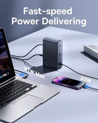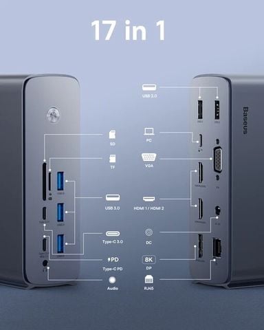 Baseus UnionJoy Pro17-Port bao gồm: 1 cổng Ethernet, 2 cổng HDMI, 2 cổng DisplayPort, 2 cổng USB-C, 4 cổng USB-A 3.0, 2 cổng USB-A 2.0, 1 cổng microSD, 1 cổng SD và 2 cổng âm thanh. Với các cổng này, cho phép bạn kết nối nhiều thiết bị với máy tính của mình như máy tính xách tay, máy tính để bàn, điện thoại di động, máy tính bảng, máy ảnh, chuột, bàn phím và nhiều thiết bị khác.