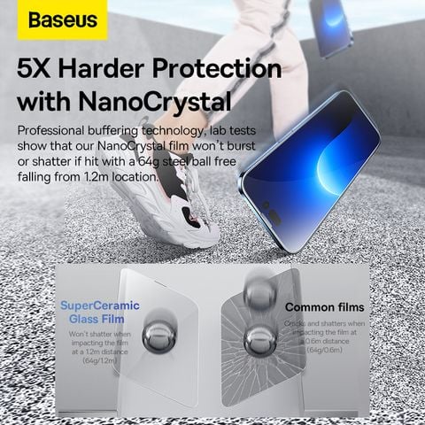 Cộng nghệ đệm chuyên nghiệp các thí nghiệm cho thấy màng NanoCrystal sẽ không bị vỡ với quả cầu thép năng 64g có rơi xuống ở khoảng cách 1m2 cũng không bị vỡ kính