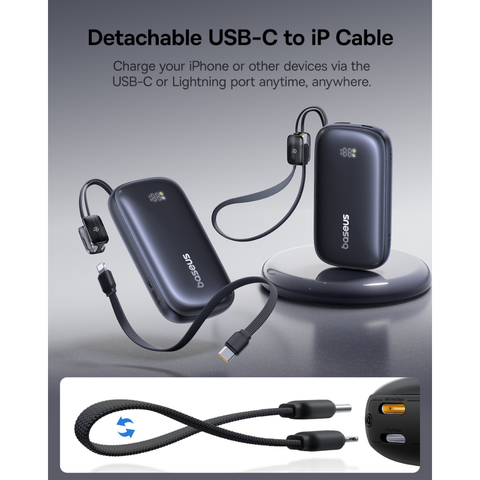 Một trong những tính năng nổi bật của sản phẩm là cáp tích hợp có thể tháo rời, hỗ trợ cả cổng USB-C và Lightning. Điều này mang lại sự linh hoạt tối đa, cho phép bạn sạc nhiều loại thiết bị mà không cần phải mang theo nhiều loại cáp khác nhau.