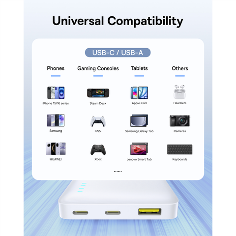 Được trang bị nhiều cổng ra (1*USB, 2*USB Type-C), pin sạc dự phòng này tương thích với hầu hết các thiết bị di động hiện nay. Cổng Type-C còn hỗ trợ sạc vào nhanh chóng cho chính pin dự phòng, giúp bạn tiết kiệm thời gian nạp lại năng lượng.