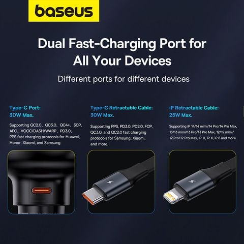 Tính năng Tẩu Sạc Ô Tô Baseus Enjoyment Pro Car Charger Tích Hợp Cáp Type C & iPhone Cable 60W