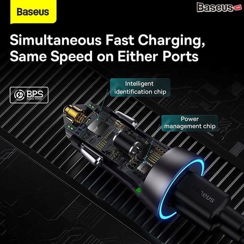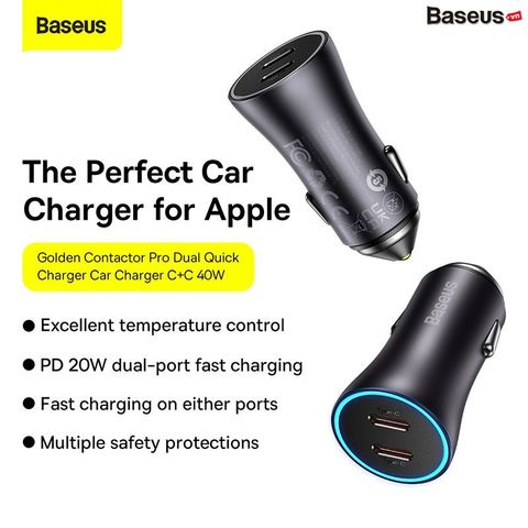 - Là tẩu sạc nhanh chuyên dụng trên xe ô tô, đặc biệt Baseus Golden được trang bị cả 2 cổng sạc Type C với tổng công suất lên đến 40W giúp cho bạn có thể sạc pin cho nhiều thiết bị hiện nay như : IPhone, IPad, Huawei, Samsung, Xiaomi